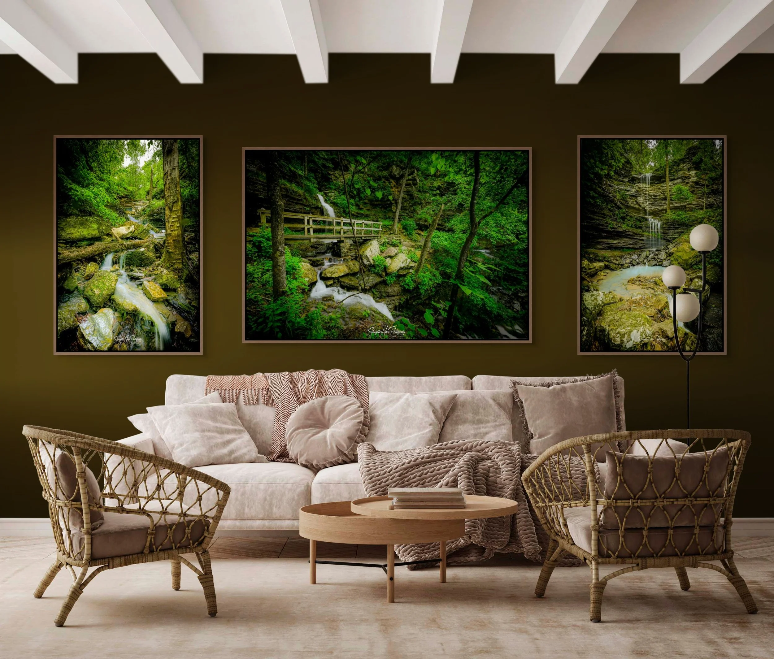 Step into the tranquil embrace of Northwest Arkansas with “Tanyard Thinking Point”—a stunning waterfall canvas print photographed just below the iconic Tanyard Creek Falls in Bella Vista. This lush, vibrant scene captures sunlight filtering through a leafy canopy, water rushing over ancient Ozark stone, and a peaceful rock ledge inviting you to pause and reflect.